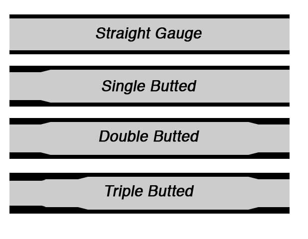 This type of internal frame butting isn't usually noticeable from the exterior, but with a trained ear you can tell which frames have been butted and which haven't. Here's a tip: use your nail to flick the top tube of your frame 2 inches from the seat tube weld, then use your nail to flick the center of the tube. If you can hear a considerable difference then you've got the ear! If it's butted then the center should have a more hollow sound then the welded joint area. Below is a diagram that shows the different variations of butting.